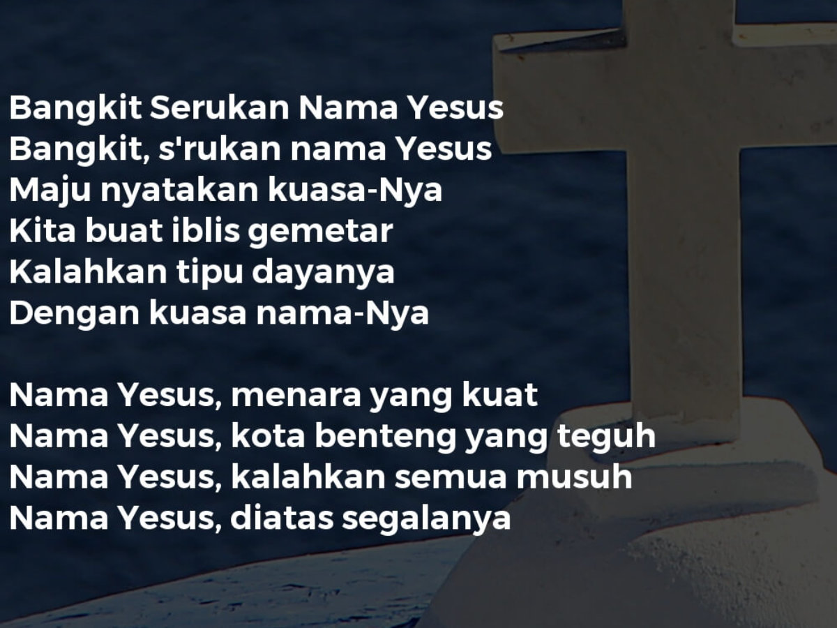 Transpose Chord E Verse. G c d bangkit serukan nama yesus g c d maju nyatakan kuasa-nya em f d kita buat iblis gemetar em f d kalahkan tipu dayanya am d dengan kuasa nama-nya chorus. E B Bangkit srukan nama Yesus Cm A B Maju nyatakan kuasa-Nya Cm A Kita buat iblis gemetar Cm A Kalahkan tipu dayanya Fm A B Dengan kuasa nama-Nya Chorus. Erwin Badudu Franky Sihombing Key. Bangkit srukan nama Yesus maju nyatakan kuasa-Nya Kita buat Iblis gemetar Kalahkan tipu dayanya Dengan kuasa nama-Nya Nama Yesus menara yang kuat Nama Yesus kota benteng yang teguh Nama Yesus kalahkan semua musuh Nama Yesus di atas sgalanya.