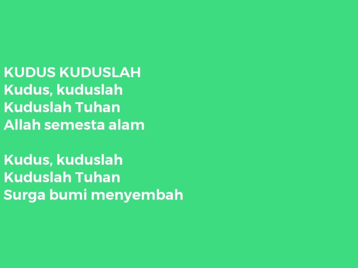 KUDUS KUDUSLAH Kudus kuduslah Kuduslah Tuhan Allah semesta alam Kudus kuduslah Kuduslah Tuhan Surga bumi menyembah Email This BlogThis. Lirik Lagu Rohani Kuduslah Tuhan. Kudus kudus kudus kuduslah Tuhan Suci suci suci sucilah Tuhan. KekudusanMu ya Tuhan menyucikan baitMu Sluruh umat sujud menyembah Di hadapan tahta Allah Bapa Pujian dan hormat kemuliaan dan kuasa Skarang dan slamanya. Kudus Kuduslah Kuduslah Tuhan Allah Semesta Alam Kudus Kuduslah Kuduslah Tuhan Surga Bumi Menyembahmu.
