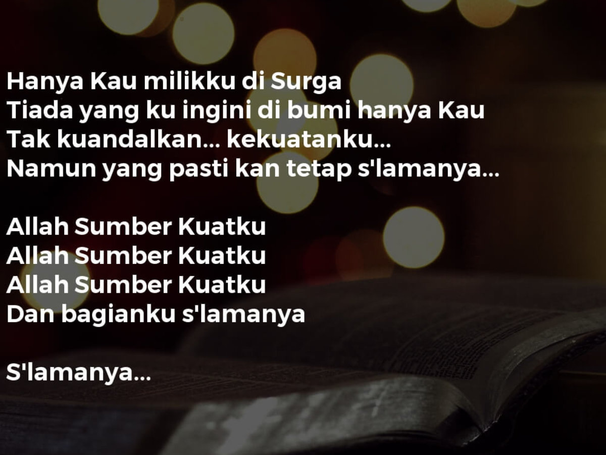 Tweet ALLAH SUMBER KUATKU Hanya Kau milikku di Surga Tiada yang ku ingini di bumi hanya Kau Tak kuandalkan. Allah Sumber Kuatku Allah Sumber Kuatku Allah Sumber Kuatku Dan Bagianku Slamanya __2x. Lirik Allah Sumber Kuatku. Doa Mengubah Segala Sesuatu. Lirik Allah sumber kuatku EUGENE GRECO Hanya Kau milikku di surga Tiada yang kuingini di bumi hanya kau Tak kuandalkan kekuatanku Namun yang pasti kau tetap slamanya Chorus.